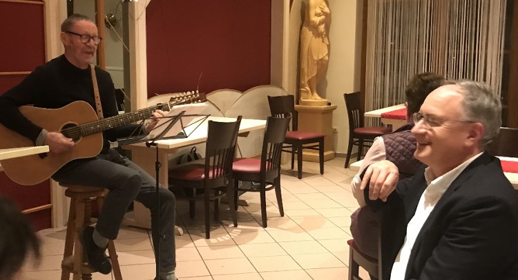 Amüsiert hört Andreas Stoch dem „Mostlied“ von Eckard Schlumpberger zu